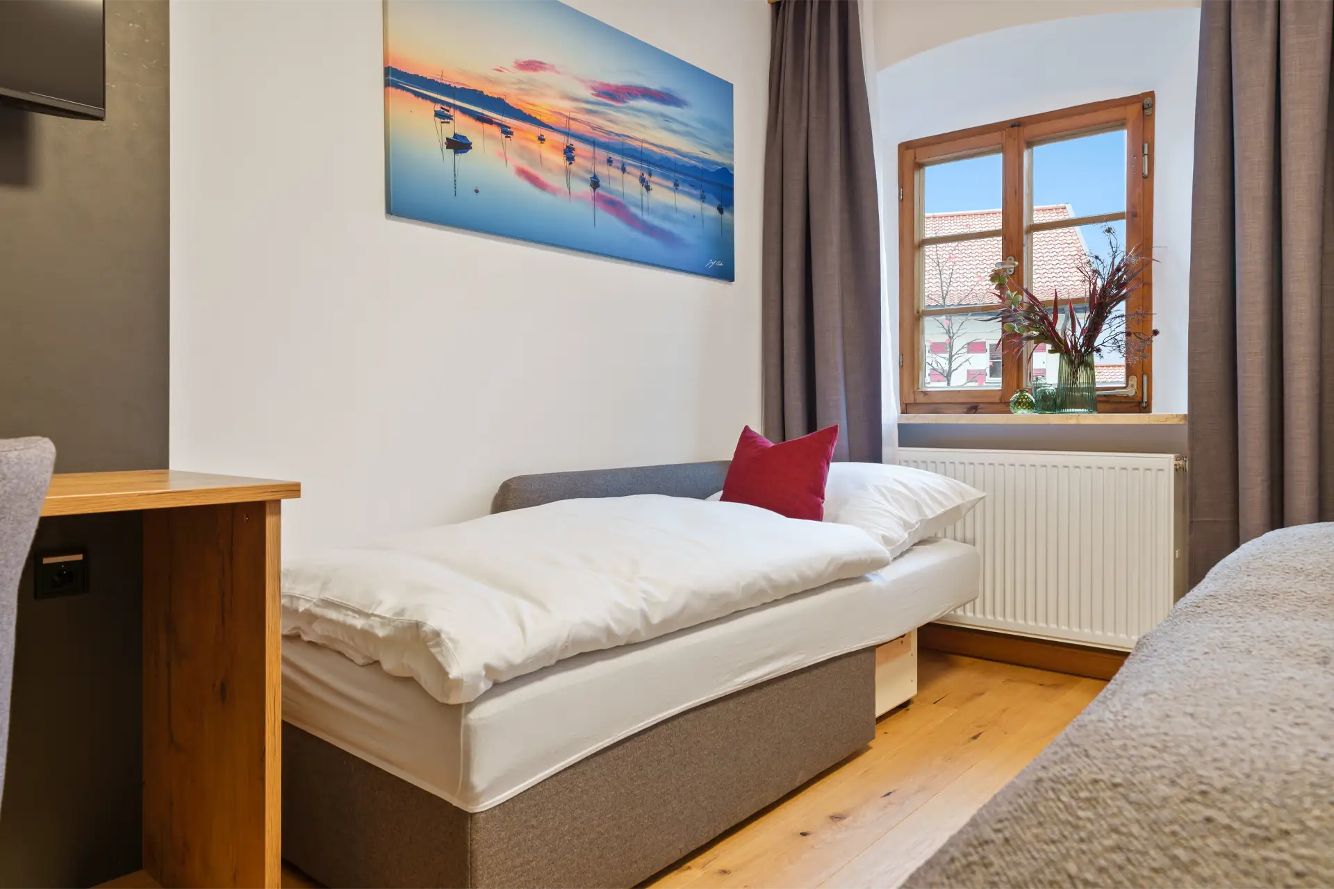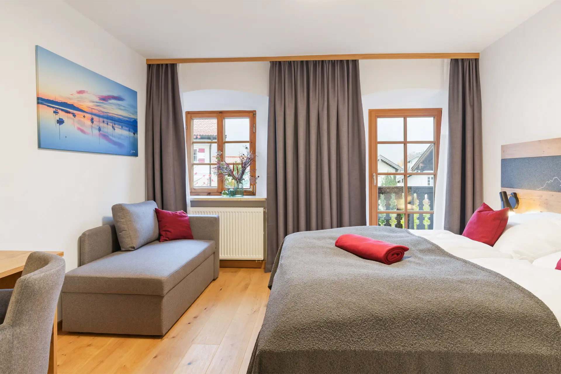 Ihr Wohlfühlzimmer am Kirchberg. Genießen Sie erholsame Urlaubstage in unserem liebevoll ausgestatteten Doppelzimmer bis zu 3 Personen im 1. Obergeschoss.