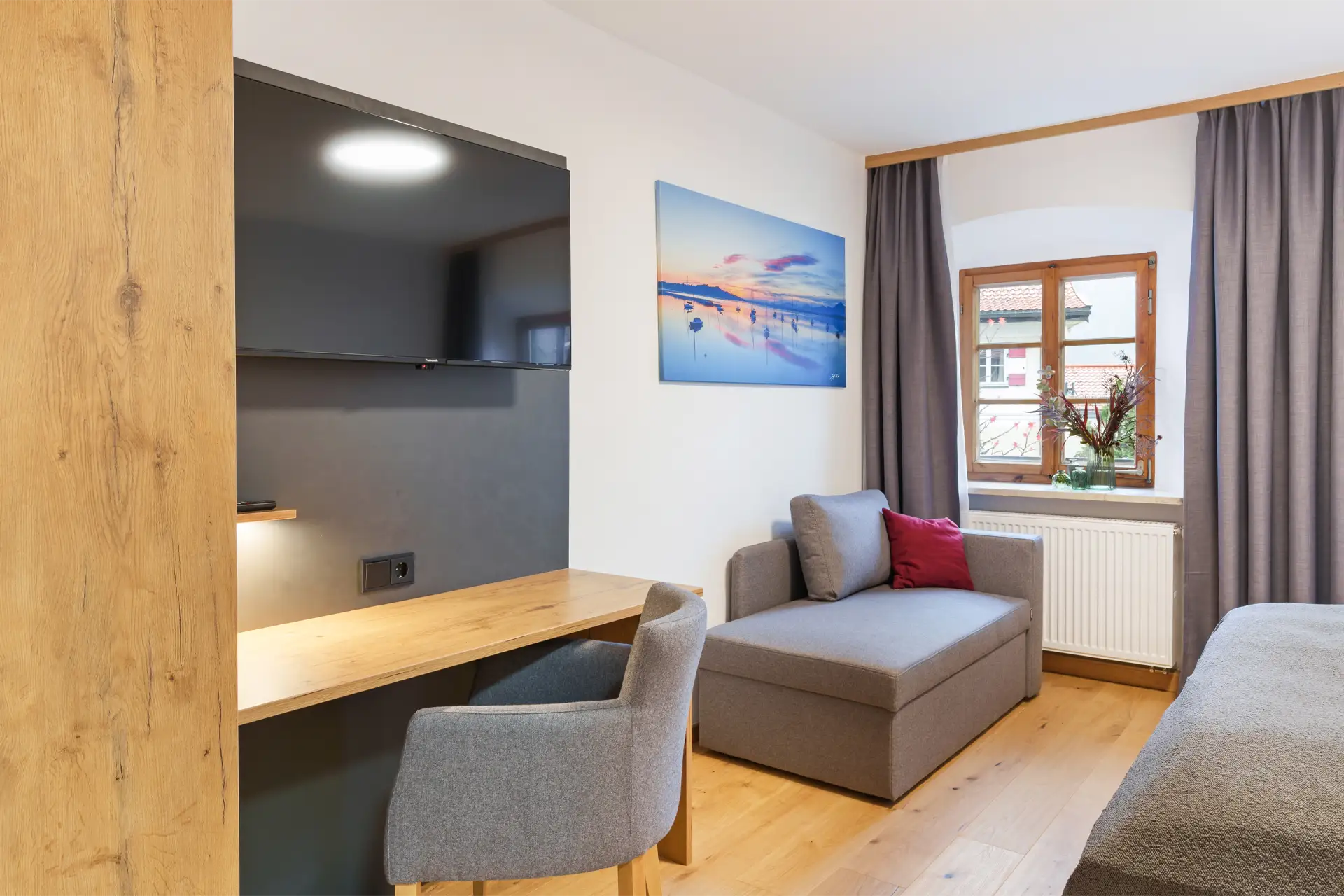 Zur Ausstattung gehören moderne Annehmlichkeiten wie Dusche, WC, Fön, Smart-Kabel-TV, Safe, W-LAN, Kofferablage und ein Schreibtisch, der sich auch ideal fürs Homeoffice eignet.