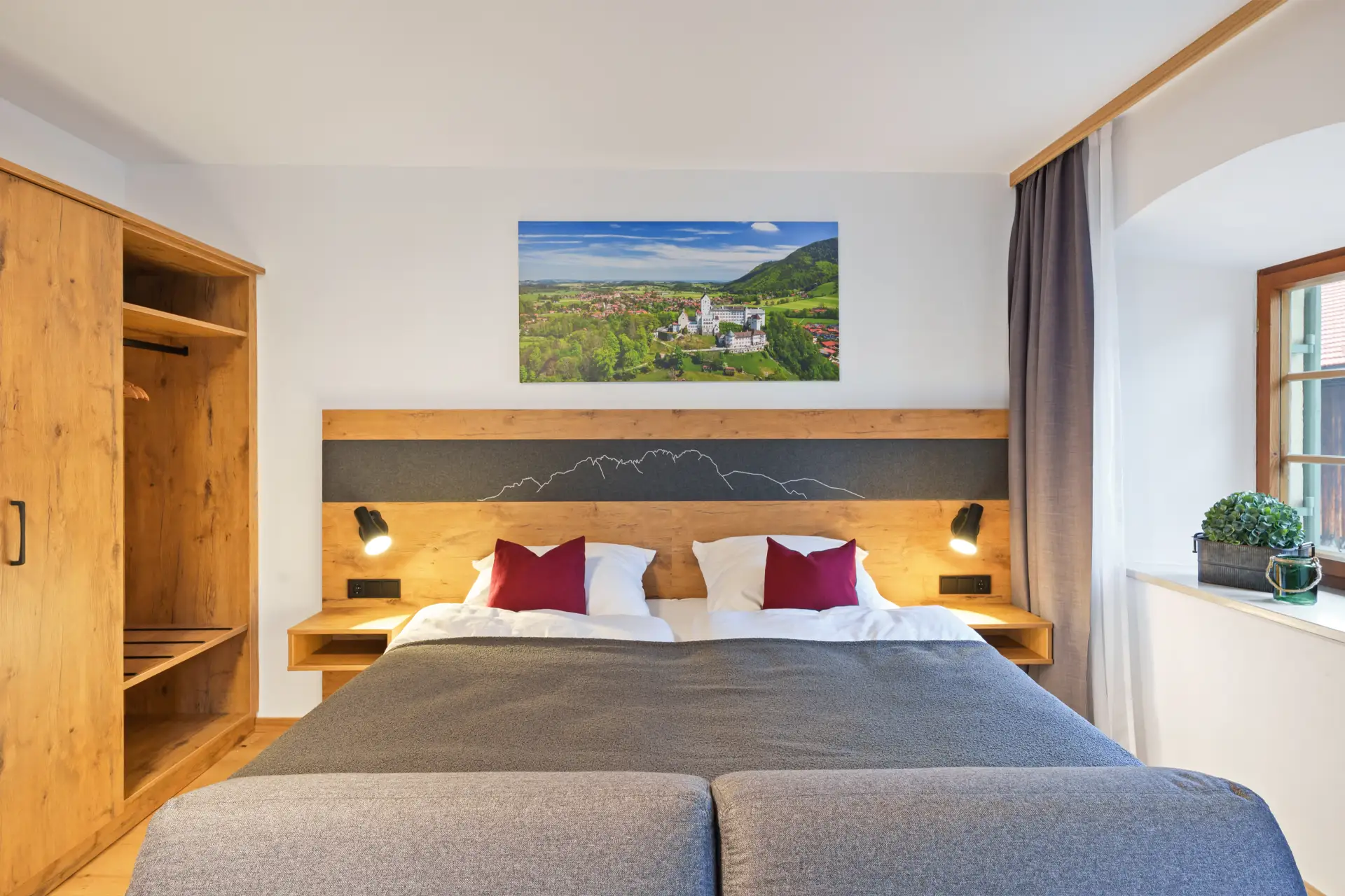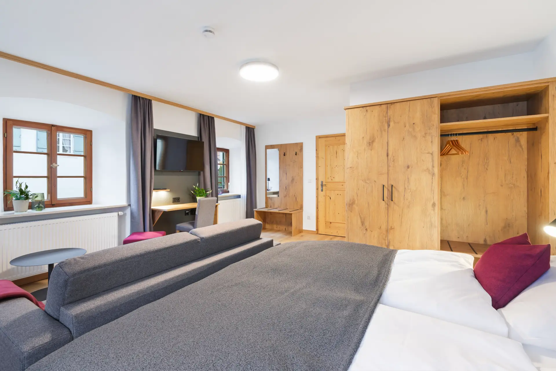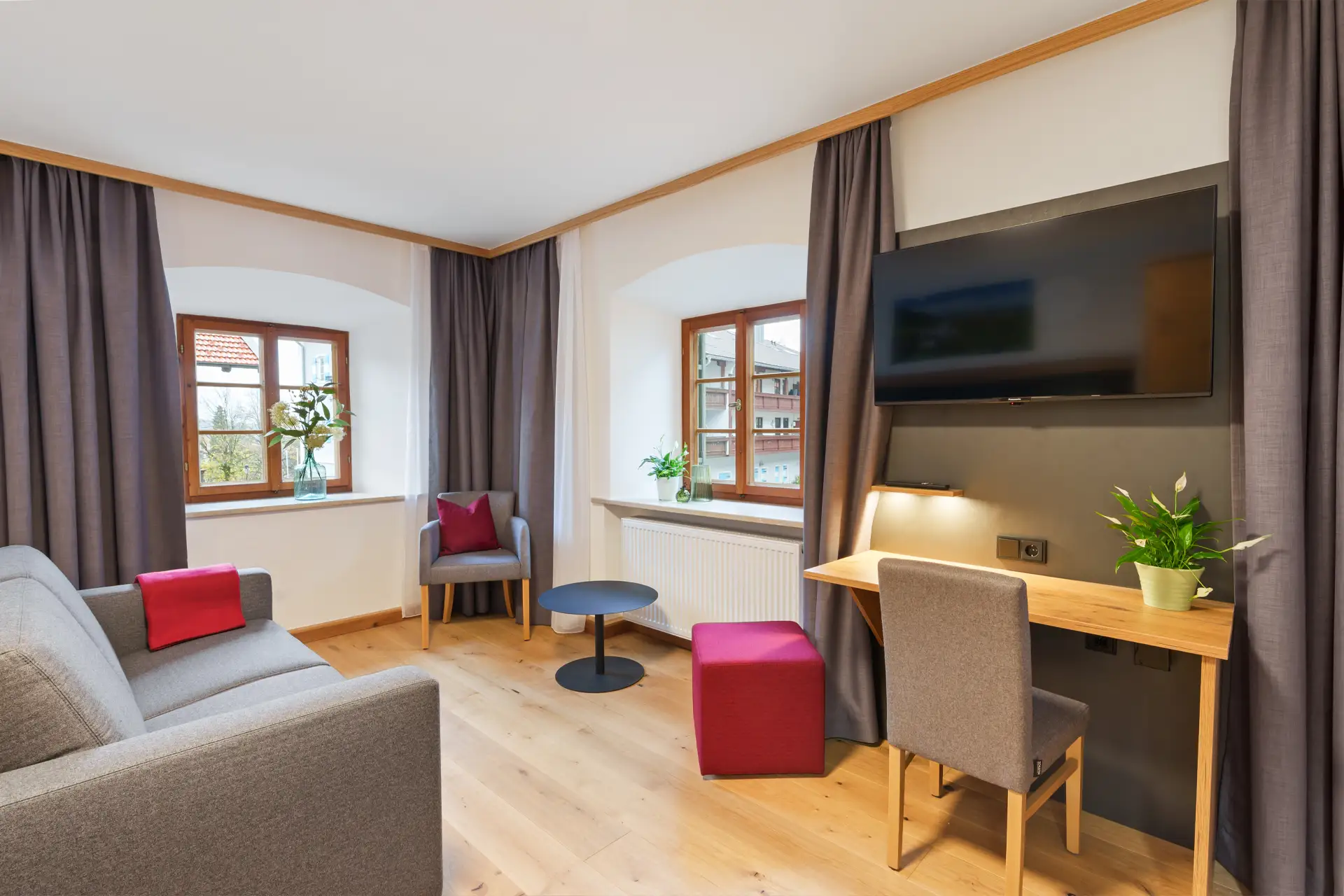Zur Ausstattung gehören moderne Annehmlichkeiten wie Dusche, WC, Fön, Smart-Kabel-TV, Safe, WLAN, Kofferablage sowie ein Schreibtisch, der sich auch ideal fürs Homeoffice eignet. Der warme Charakter echter Holzparkettböden schafft eine behagliche Atmosphäre. Ein Hund ist auf Anfrage im eigenen Körbchen gegen Aufpreis erlaubt, bitte halten Sie mit uns Rücksprache.